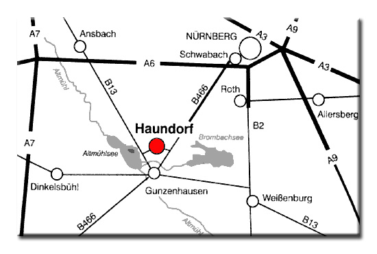 Willkommen Die Gemeinde Haundorf liegt im südwestlichen Mittelfranken. Haundorf ist seit dem Jahre 1997 Staatlich anerkannter Erholungsort. Durch seine Lage zwischen dem ruhigen Mönchswaldgebiet und den Fränkischen Seen - Altmühlsee und Brombachsee - ist das Gebiet für den ruhigen, erholsamen Urlaub wie geschaffen. Seine Nähe zu den Seezentren ermöglicht aber dem Urlauber alle Freizeitmöglichkeiten, die sich bieten, auf kurzem Wege zu nutzen. |